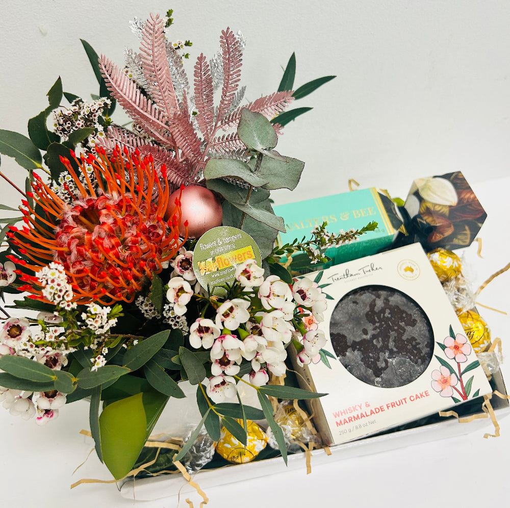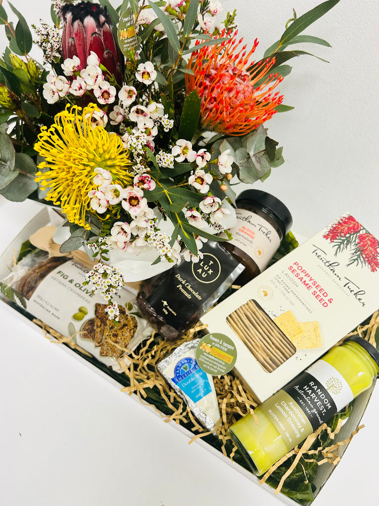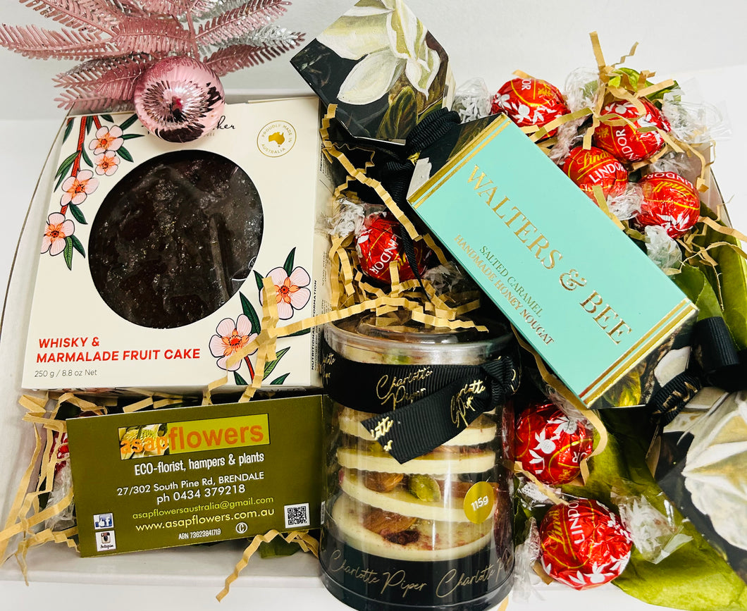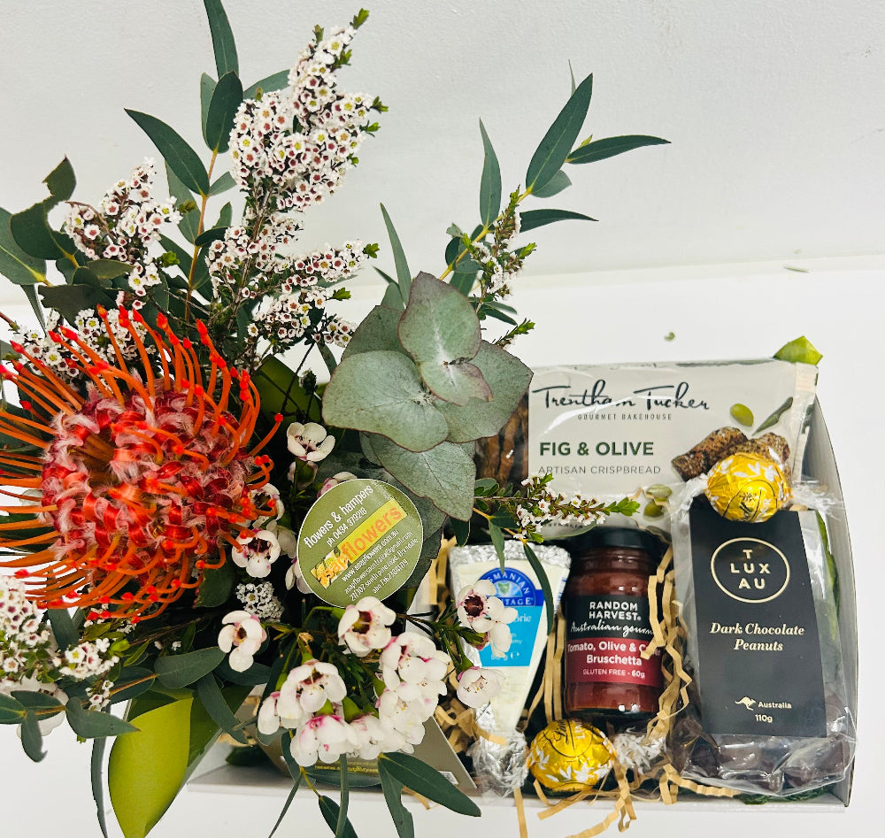 sweet hampers include whiskey fruit cake and treats click on drop down for all other inclusions and savoury includes bruschetta, cheese, crackers etc etc both have a add flower option (long lasting natives)